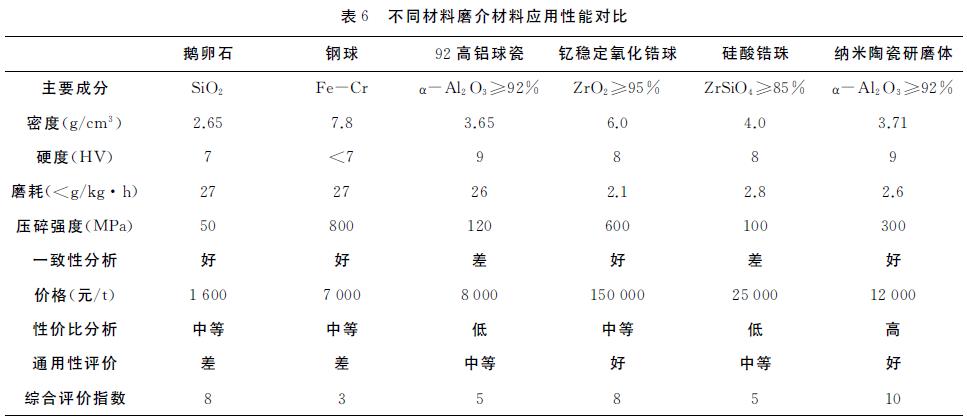 納米陶瓷研磨體在研磨行業(yè)中的地位和作用在現(xiàn)有的磨介材料中,除越來(lái)越少的天然鵝卵石外,其他都是人造材料。如,鋼球、氧化鋁球、氧化鋯球、硅酸鋯珠、硅珠(玻璃珠)等,其應(yīng)用性能列表對(duì)比見表6。判斷磨介在實(shí)際應(yīng)用中的優(yōu)劣最主要的是其適用性和經(jīng)濟(jì)指標(biāo)。從表6可知,納米陶瓷研磨體是綜合性能最佳的品種,在市場(chǎng)中其應(yīng)用潛力最大。