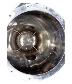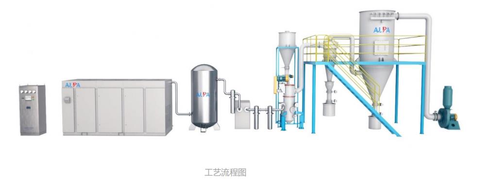 壓縮空氣經(jīng)過(guò)濾干燥后,通過(guò)拉瓦爾噴嘴高速噴射入粉碎腔,在多股高壓氣流的交匯點(diǎn)處物料被反復(fù)碰撞、磨擦、剪切而粉碎,粉碎后的物料在風(fēng)機(jī)抽力作用下隨上升氣流運(yùn)動(dòng)至分級(jí)區(qū),在高速旋轉(zhuǎn)的分級(jí)渦輪產(chǎn)生的強(qiáng)大離心力作用下,粗細(xì)物料分離,符合粒度要求的細(xì)顆粒通過(guò)分級(jí)輪進(jìn)入旋風(fēng)分離器和除塵器收集,粗顆粒下降至粉碎區(qū)繼續(xù)粉碎。
