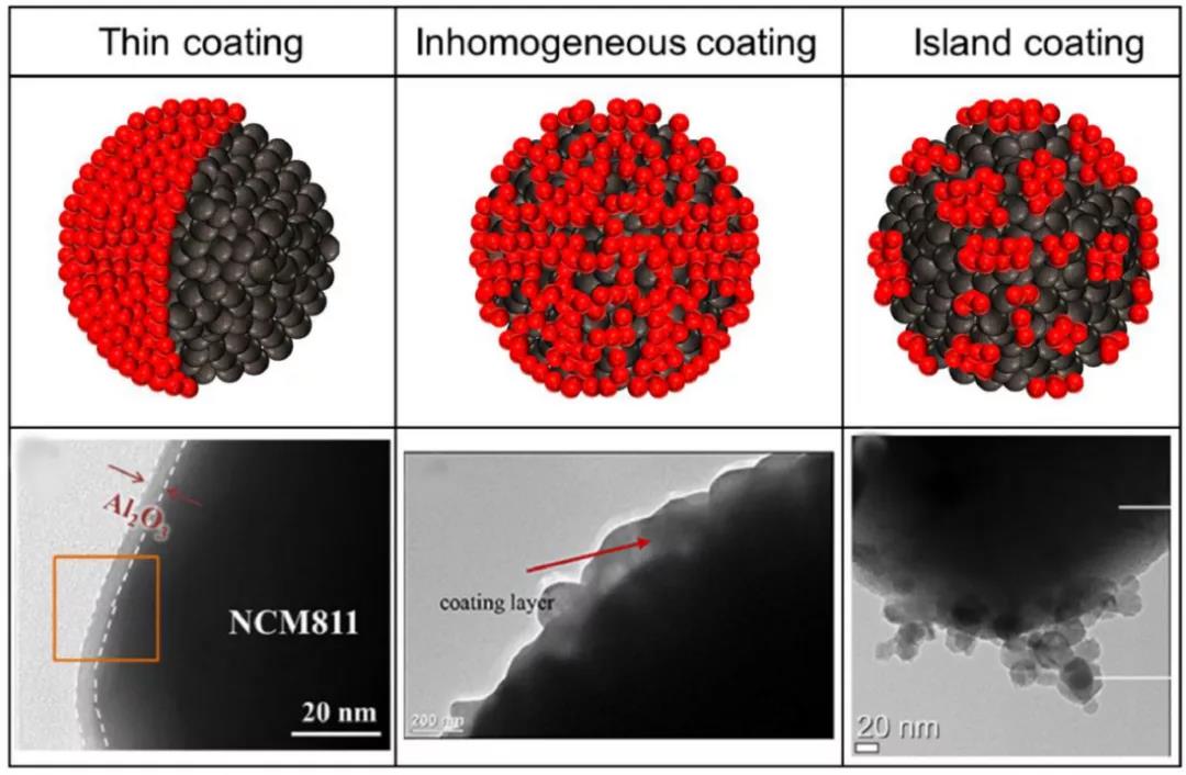 包覆層應(yīng)均勻且薄。正極顆粒的完全覆蓋將保護(hù)正極免受電解質(zhì)侵襲,抑制副反應(yīng)。此外,薄包覆層能提高界面處的動(dòng)力學(xué),改善電池性能。