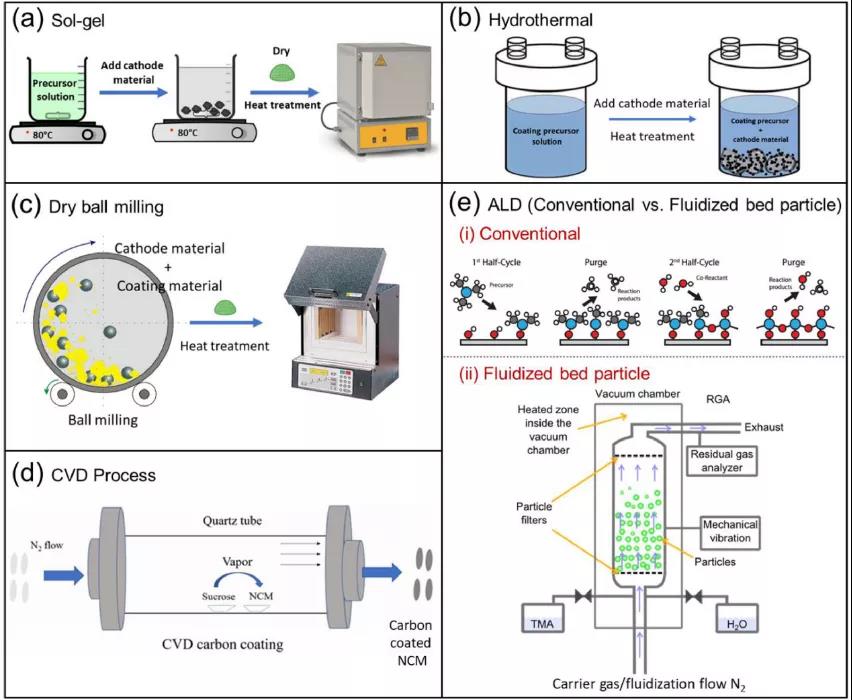 溶膠凝膠包覆工藝通常用于合成正極材料以及表面包覆。然而,由于使用水或其他溶劑,增加了成本。另外水之類的溶劑會(huì)導(dǎo)致鋰浸出并改變正極表面化學(xué)計(jì)量。