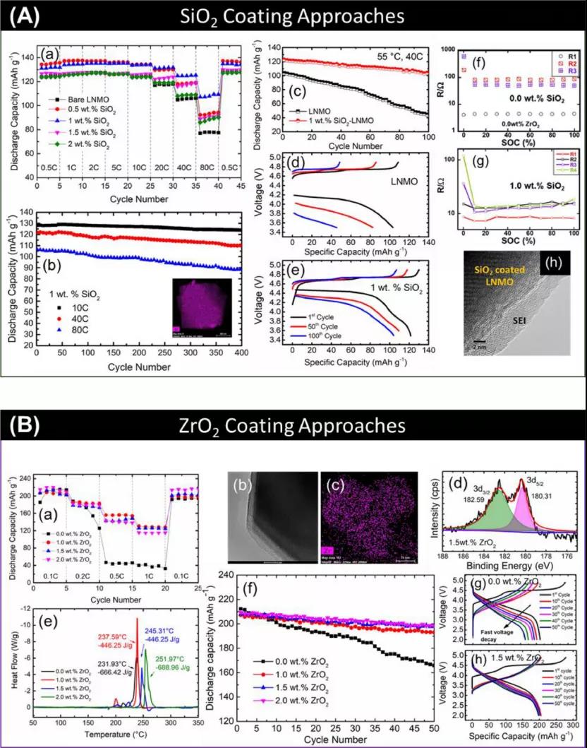 圖4、(A)SiO2包覆LNMO電化學(xué)性能(B)ZrO2包覆(NCM)材料電化學(xué)性能。