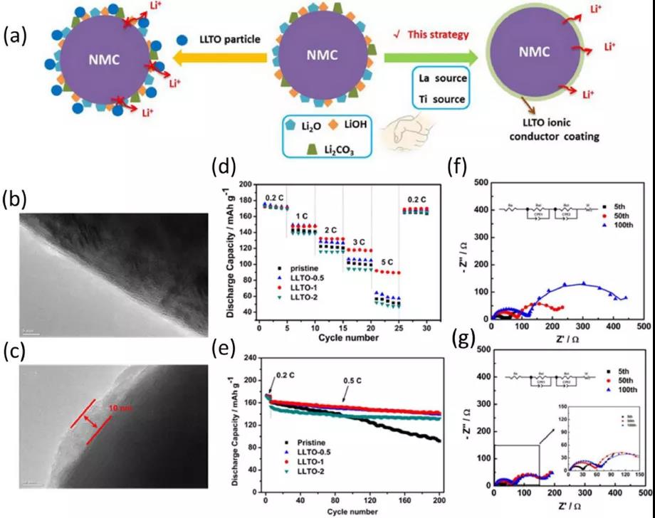 圖7、LLTO改性的LiNi0.6Co0.2Mn0.2O2示意圖及其電化學(xué)性能