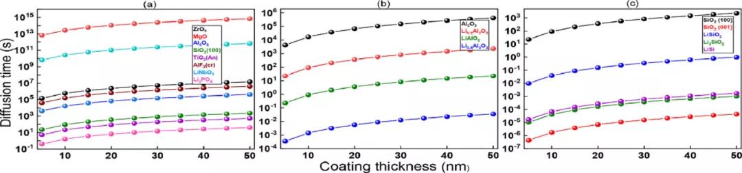 某些表面包覆會(huì)阻礙離子擴(kuò)散,但提供其他優(yōu)勢(shì),而某些包覆可以增強(qiáng)離子擴(kuò)散,但損害其他性能。在采用包覆時(shí),折衷考慮這些影響一直是電池研究的重點(diǎn)。包覆厚度與包覆層的鋰離子擴(kuò)散率之間的結(jié)構(gòu)特性相關(guān)性是衡量折衷標(biāo)準(zhǔn)的一個(gè)有效方法。圖10提供了擴(kuò)散時(shí)間與包覆厚度的關(guān)系。大多數(shù)氧化物和氟化物的鋰離子擴(kuò)散率極低。對(duì)于較厚的包覆,擴(kuò)散時(shí)間更長(zhǎng)。這些表面包覆厚度應(yīng)小于10nm,以獲得更好的電化學(xué)性能。