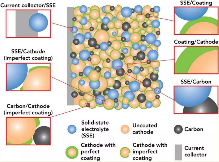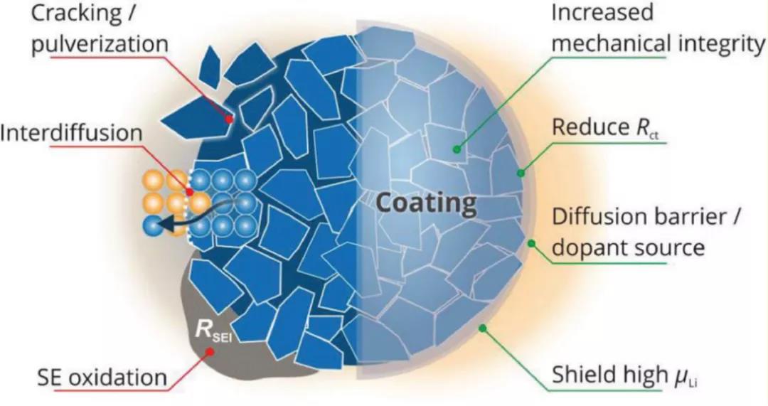包覆層應(yīng)均勻且完全覆蓋正極顆粒,并保證正極顆粒之間的接觸以提供導(dǎo)電網(wǎng)絡(luò)。硬而脆的包覆層在電極制造過程中易形成裂紋,因此形成顆粒接觸,但可能導(dǎo)致SE分解。如果包覆層是塑性且可變形,則它可以通過變形而形成新的接觸點(diǎn)而不會(huì)形成裂紋。表面包覆應(yīng)抑制或適應(yīng)正極材料的體積變化,以保持顆粒間的接觸。另外,正極活性材料和SE之間也可能相互擴(kuò)散。包覆會(huì)抑制這種相互擴(kuò)散,減輕電阻性界面的形成。