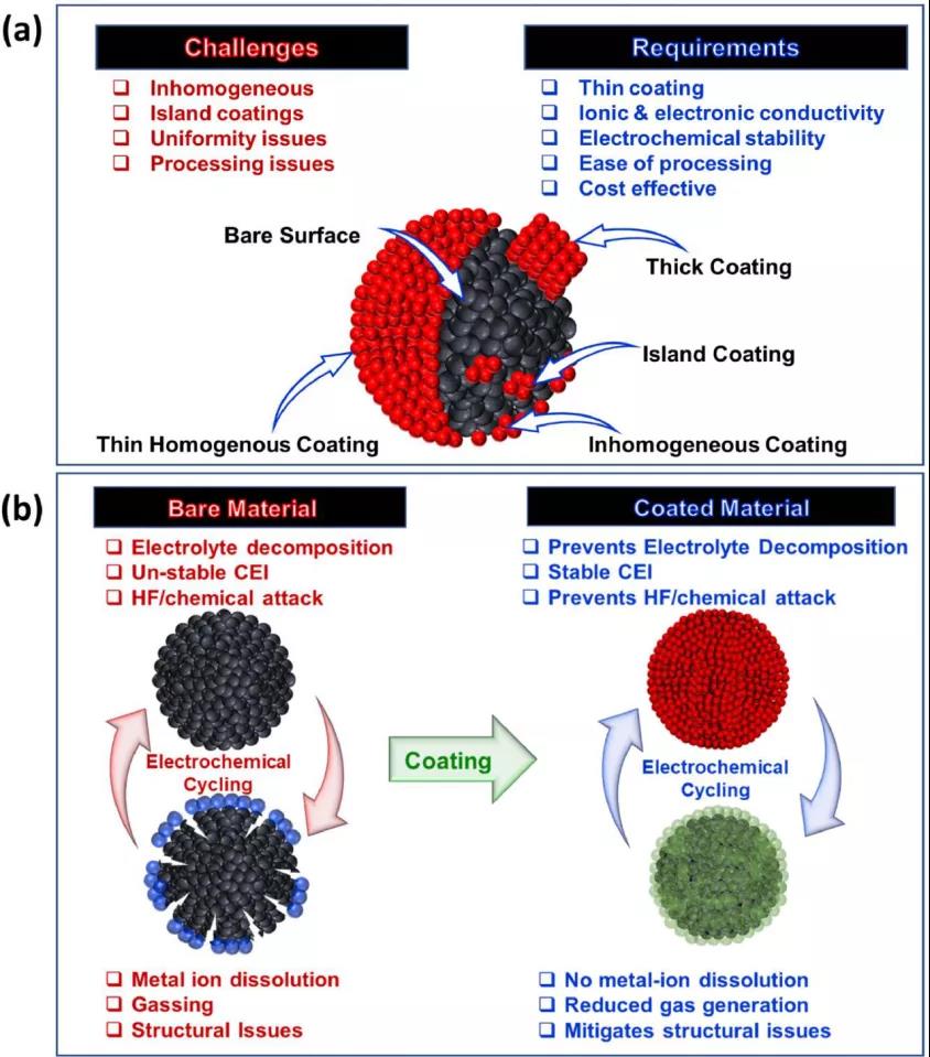 圖1、(a)正極材料表面包覆的要求和挑戰(zhàn),(b)作用和功能。