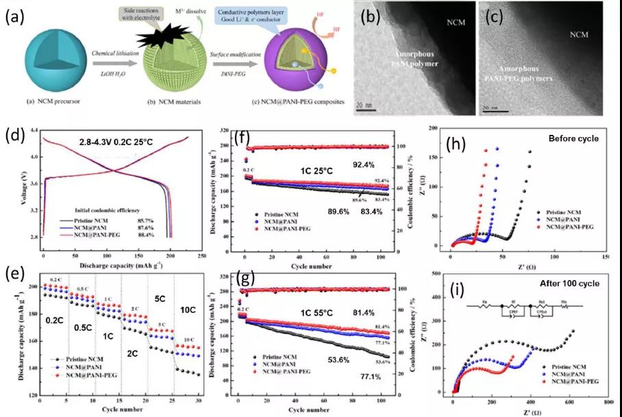 導(dǎo)電聚合物包覆可以形成具有高電子電導(dǎo)率的均勻薄膜,改善正極/電解質(zhì)界面的電荷轉(zhuǎn)移。這類聚合物可以適應(yīng)體積變化,減少裂紋形成。圖8顯示PANI-PEG包覆的LiNi0.8Co0.1Mn0.1O2(NCM-811)。PANI-PEG具有高離子電導(dǎo)率和電子電導(dǎo)率。倍率性能提高可歸因于電子電導(dǎo)率和電荷轉(zhuǎn)移的提高。循環(huán)性能也有所提高,歸因于副反應(yīng)被抑制。