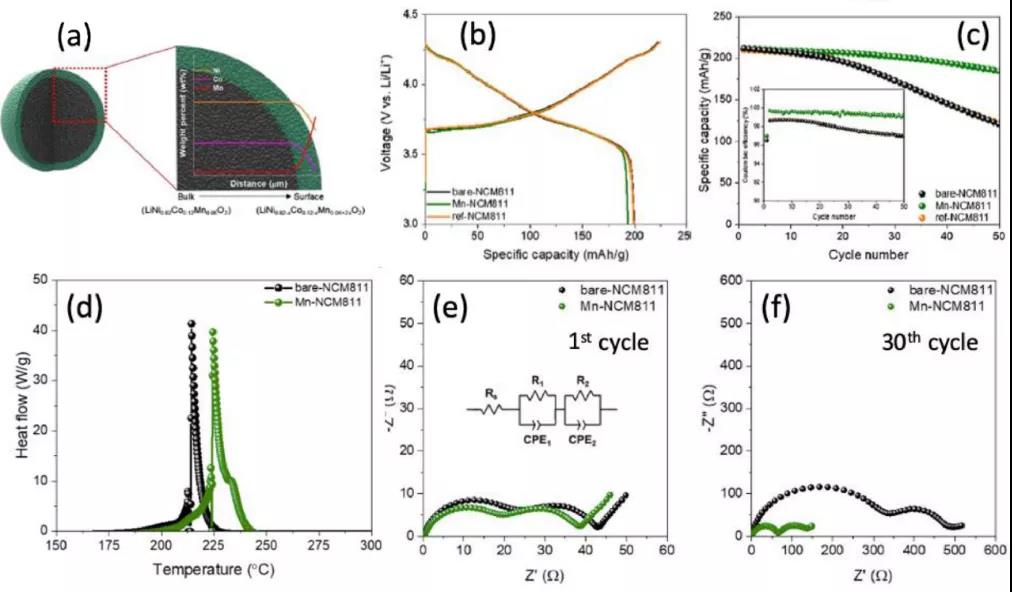 圖9、錳表面摻雜的富鎳正極示意圖及其電化學(xué)性能